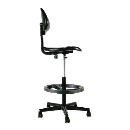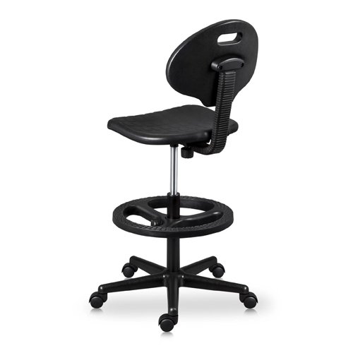 Silla laboratorio, asiento y respaldo en poliuretano, con aro apoyapies regulable en altura, base poliamida con ruedas blandas (para piso duro) de 50 mm. Regulación de altura mediante cilindro de gas neumático de 260 mm. Respaldo fijo. Altura de asiento mínima: 60 cm; altura de asiento máxima: 82 cm.